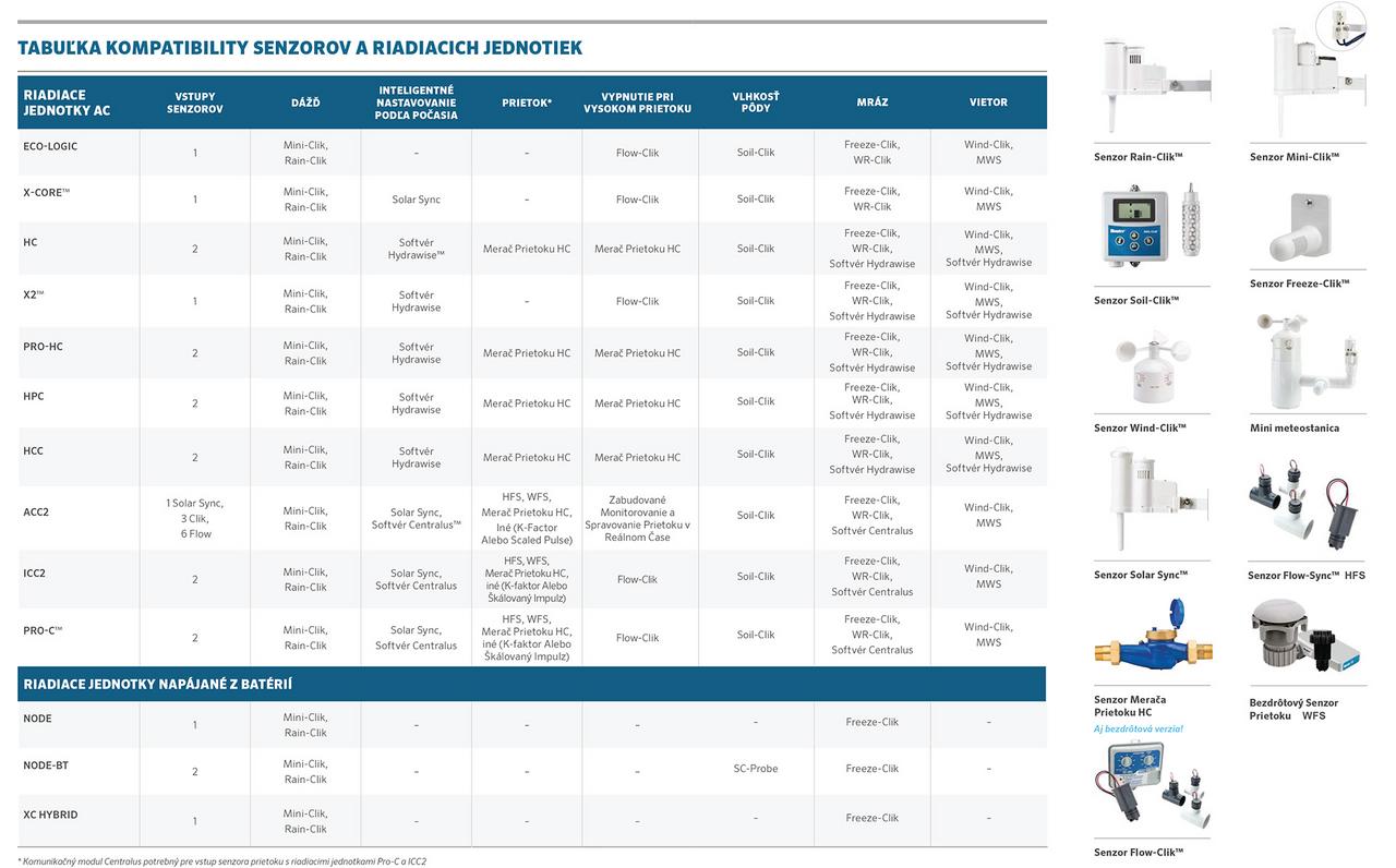 - Kompatibilný s riadiacimi jednotkami Hunter, Rain Bird, K-Rain podporujúce pripojenie k skupine senzorov typu NC (normálne zatvorený).
